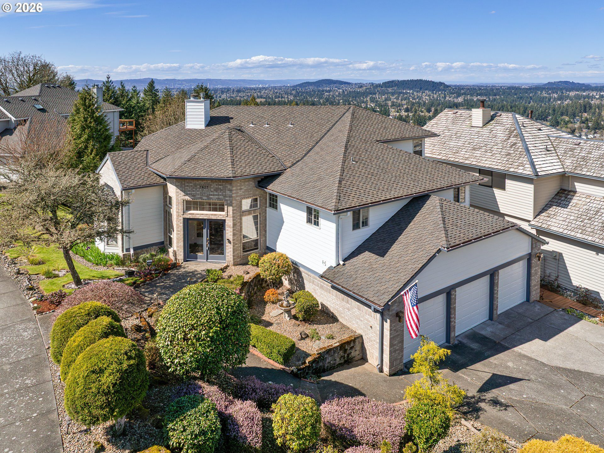 With sweeping territorial and downtown views, this custom-designed home offers a rare combination of space and flexibility, located alongside a greenspace for a peaceful backdrop. The main level features an island kitchen with granite countertops that opens to the family room, creating an ideal setting for everyday living and entertaining. A formal dining room lined with a wall of windows showcases the stunning views. The vaulted living room with fireplace adds warmth and architectural interest. The spacious primary suite provides a relaxing retreat with a jetted tub and walk-in closet. Downstairs, the versatile lower level is perfect for multi-generational living or guest quarters, complete with a large recreation room, kitchenette, fireplace, bedroom, full bath, and home theater system. Step outside to the expansive back deck, perfect for enjoying the views, and entertaining. New exterior paint and gutters in 2025. [Home Energy Score = 6. HES Report at https://rpt.greenbuildingregistry.com/hes/OR10037124]